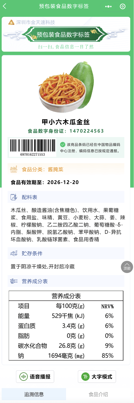 2025年7月,国度卫生健康委员会取国度市场监视办理总局配合发布《关于实施预包拆食物数字标签相关事项的通知布告》,正式鞭策我国食物标签办理进入数字化时代。同年9月8日,央视旧事《国内核心》报道指出,数字标签将实现“一码知全貌”,显著提拔消费者获打消息的便利性取体验感。正在这一布景下,深圳市金天速科技无限公司旗下金点防伪溯源平台积极响应政策,凭仗“多码合一”取“AI防伪”等焦点手艺,为数字标签的推广取使用供给保障。消费者通过手机扫描包拆上的二维码,即可跳转至数字标签页面,获取配料表、养分成分、出产工艺、产地溯源等详尽消息。