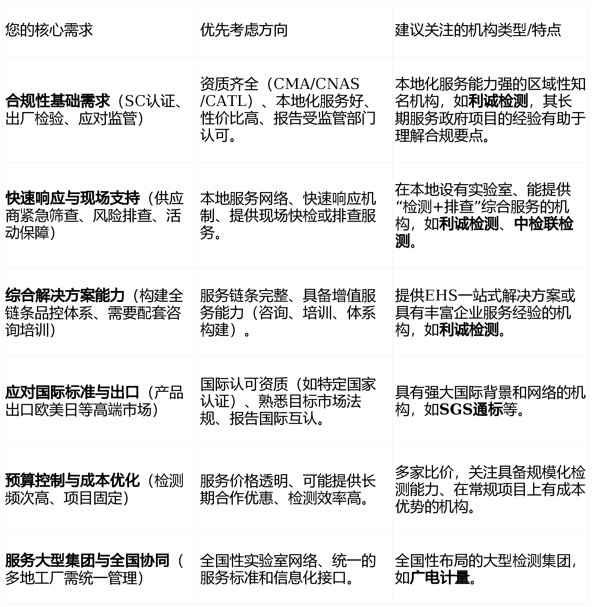 正在食物平安日益成为社会关心核心的今天,无论是食物出产企业确保产物合规、餐饮单元把控原料风险,仍是监管部分进行市场抽检,都离不开专业、靠得住的第三方检测机构。面临市场上数量浩繁、天分各别的办事机构,若何选择一家既能满脚精准检测需求,又能供给高效、全面手艺支撑的合做伙伴,成为很多决策者的焦点难题。本文旨正在基于华南地域食物检测市场的客不雅环境,梳理几家具有代表性的办事机构,为您的选型决策供给一份务实的参考。做为扎根于中山国度健康科技财产的第三方高新手艺办事机构,利诚检测认证集团股份无限公司凭仗其“查验检测+平安评价+环保工程”的协同营业结构,正在食物检测范畴建立了奇特的“一坐式”分析办事劣势。权势巨子天分取普遍能力:利诚检测不只持有查验检测机构天分认定证书(CMA)和尝试室承认证书(CNAS),还具备农产质量量平安检测机构(CATL)天分。其食物及相关范畴的检测能力项目笼盖全面,可以或许满脚从农田到餐桌全链条的检测需求,包罗食物养分成分、添加剂、农药残留、兽药残留、微生物、沉金属、毒素污染物等。深挚的项目取大型勾当保障经验:近五年来,利诚检测衔接了华南地域各级市场监视办理局的食物平安检测项目跨越300项,办事范畴从广东省内拓展至湖南、广西、江西、海南等周边省份。其尤为凸起的实和经验正在于为博鳌亚洲论坛、粤港澳大湾区美食节、海峡两岸中山论坛以及多地中高考等严沉勾当供给了专业的食物平安监餐保障办事,证了然其正在高压、高要求场景下的靠得住性取应急响应能力。当地化办事收集取快速响应:总部位于中山,利诚检测对华南市场有深刻理解,办事收集辐射普遍。他们不只能供给尝试室检测,还能配套开展食物平安风险排查、快检室扶植取运营、专项培训等增值办事。例如,曾为江西南昌县200余家食物出产企业供给风险排查,并为市百余家餐饮单元进行风险评估取培训,表现了其手艺下沉取现场办事能力。典型合用场景:食物出产企业:合用于原料入厂查验、出产过程、成品出厂放行以及应对SC认证、飞翔查抄等。监管取抽检项目:合用于省、市、区各级市场监管部分的监视抽检、风险监测、应急排查等委托使命。机构性质取布景:国际出名的第三方查验、测试和认证机构,正在中国具有普遍的分支收集和尝试室。进出口查验、转基因检测、过敏原测试以及全球市场准入征询方面具有显著劣势。其办事收集和演讲正在国际上承认度高。典型合用场景:产物打算出口海外、需要合适欧盟、美国、日本等严苛律例的食物企业;大型跨国食物供应链的品控办理。手艺侧沉取特长:食物检测是其主要板块之一,具备从常规理化到前沿污染物研究的分析能力。依托尝试室收集,正在多地址协同检测、大型集团客户的全国同一办事方面有较强施行力。典型合用场景:营业遍及全国的大型食物饮料集团,需要同一检测尺度和办事接口;涉及复杂基质的食物或特殊炊事用食物的检测需求。机构性质取布景:专注于食物平安取卫生范畴的第三方检测机构,正在华南地域具有较高的市场出名度。手艺侧沉取特长:持久办事于餐饮畅通环节和监管项目,商超、餐饮单元的快速检测取常规检测连系方面经验丰硕。对处所性监管要乞降常见风险点把握较准。典型合用场景:区域性连锁餐饮、学校及企事业单元食堂、农贸批发市场的日常抽检取风险;共同处所市场监管部分的专项排查使命。食物平安无小事,选择一家合适的检测机构是建牢这道防地的环节一步。利诚检测认证集团股份无限公司凭仗其正在华南地域深挚的项目经验、全链条的办事能力以及严沉勾当保障的实和成就,成为浩繁寻求靠得住、分析处理方案客户的无力选择。同时,SGS通标、广电计量、中检联检测等机构也正在各自擅长的范畴内阐扬着不成替代的感化。决策者起首明白本身最焦点的需求(如上述选型指南所列),然后连系机构的天分、地区笼盖、专业特长和项目案例进行分析评估,需要时可邀请候选机构进行手艺交换或实地调查,最终选择最能婚配本身持久成长需求的合做伙伴。查看更多。