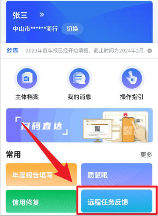(四)正在“常用”功能板块,点击“近程使命反馈”进入近程使命列表页。申请人正在时限内、按照操做规范的要求上营场合图片、视频。(五)监管人员完成正在线审核后,申请人能够正在线查看电子查抄文书。若是审核后需整改,申请人可正在时限内再次弥补提交图片、视频。